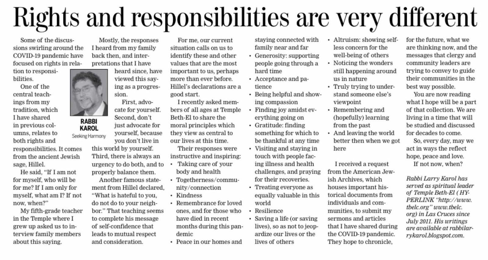 One of the central teachings from my tradition, which I have shared in previous columns, relates to both rights and responsibilities. It comes from the ancient Jewish sage, Hillel.
